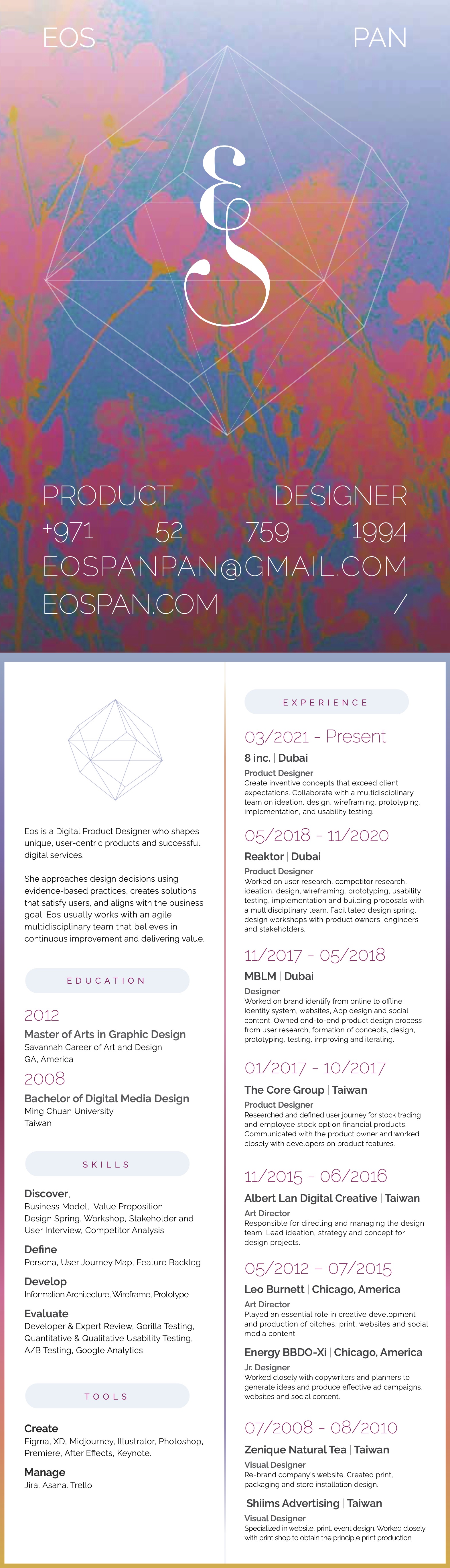 Eos Pan is an experienced Digital Product Designer who shapes unique, user-centric products and successful digital services. She approaches design decisions using evidence-based practices, creates solutions that satisfy users, and aligns with the business goal.