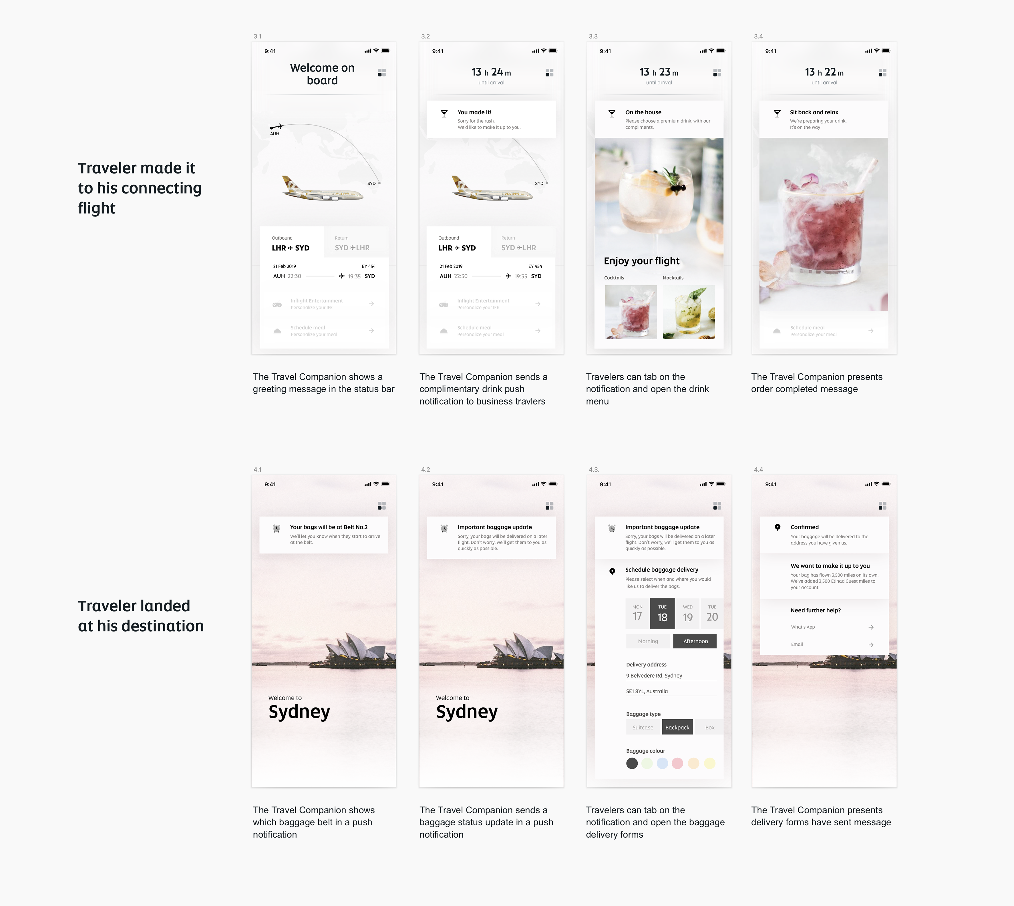 The prototype explores new solutions in receiving timely information, navigating the airport, reporting lost luggage, receiving complimentary beverages, and being compensated with extra miles.