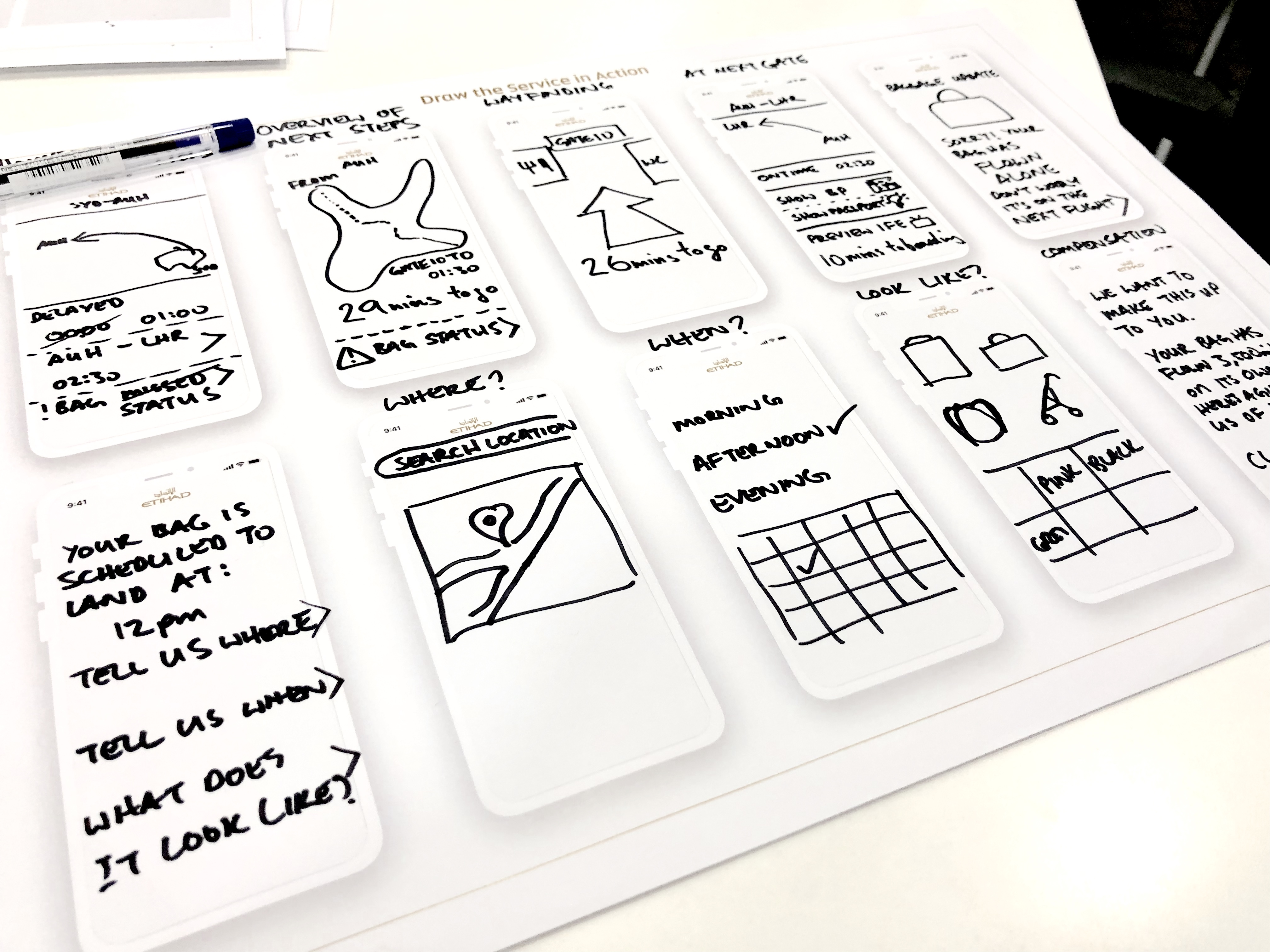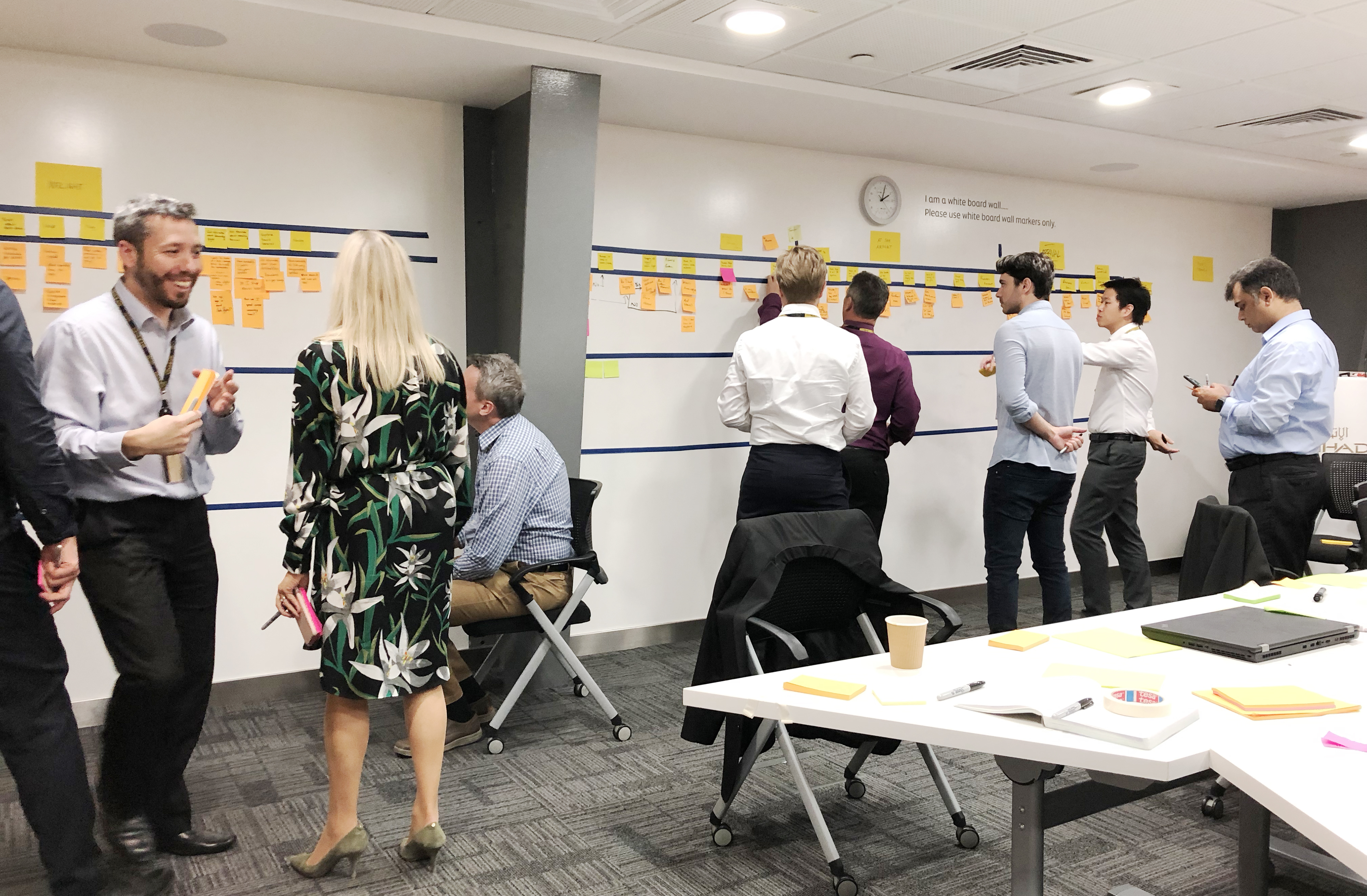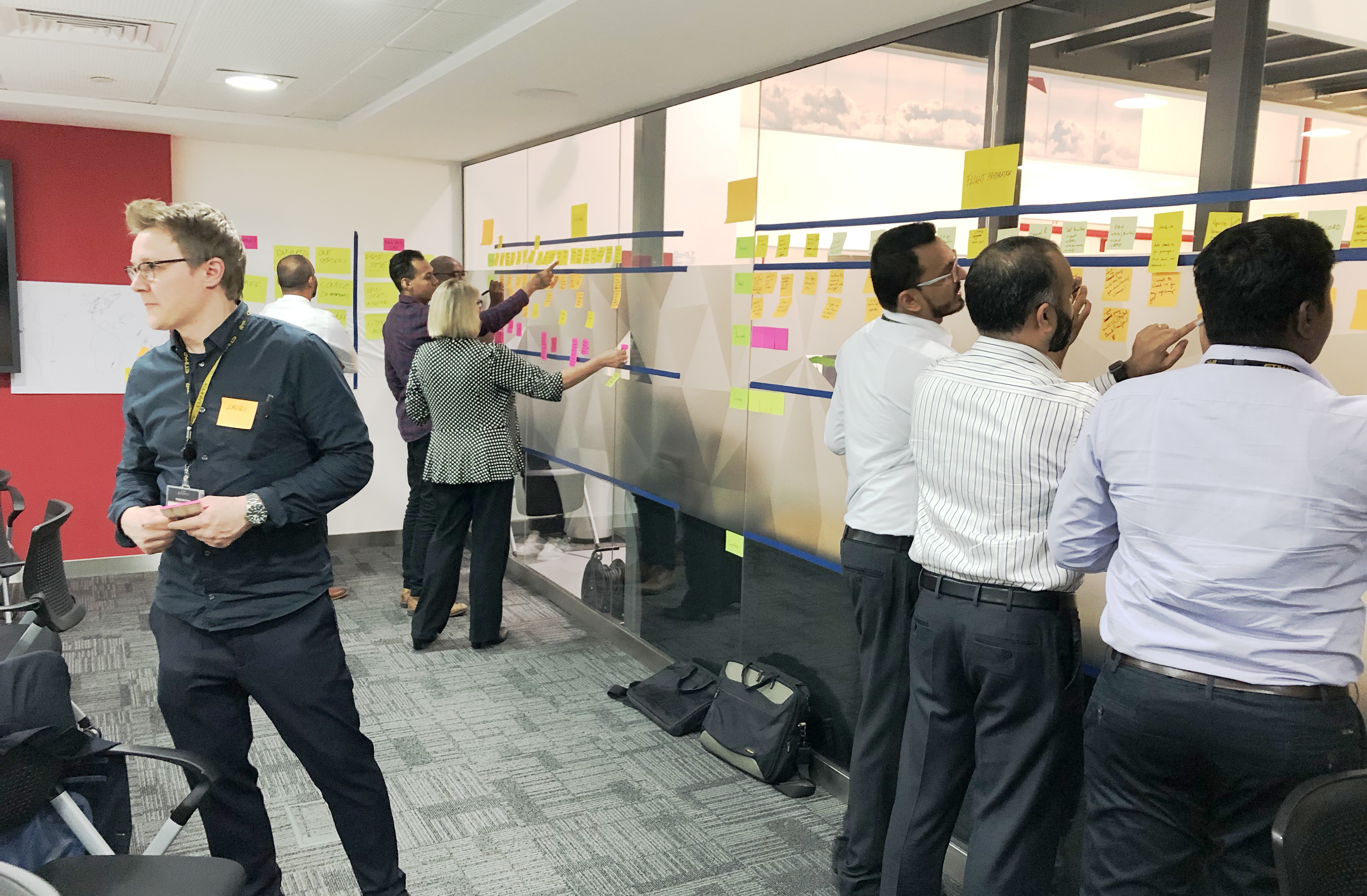 This workshop took place in Etihad’s flight model studio, where the crew train in a 1-to-1 flight cabin set model. The purpose of selecting this location was to take people out of their office so that they could be physically and mentally free from day to day duty. Hopefully, leading to a fruitful and enjoyable workshop that brought collaboration and a shared vision.